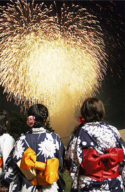 浴衣姿などで大勢の人々が来場。川崎市の発展を願って打ち上げられた花火6000発の輝きを楽しんでいた=写真。