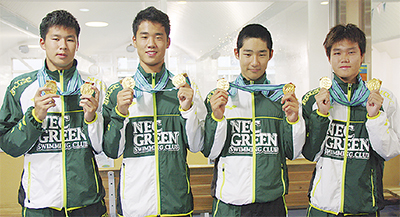 13〜14歳区分の男子400mフリーリレー、同メドレーリレーでの2冠を達成したのは、NECグリーンスイミングクラブ(NECGSC)溝の口所属の中学生4人。フリーでは3分37秒33で見事大会新記録を更新し、他を圧倒する実力の高さを見せつけた。