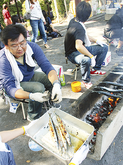 脂の乗った美味しいさんまを味わってもらおうと、東橘中学校区連合町内会は10月12日、橘公園で「さんま祭」を開いた。昨年、大雨で中止を余儀なくされたさんま祭。今年は多数の市民が来場し、次々と炭火焼きされるさんまを味わおうと、公園に長蛇の列ができた。