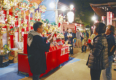 開運、家内安全、商売繁盛にご利益がある本場熊手屋の「開運熊手」が販売される。多くの露店も出店。特設舞台では、カラオケ大会や子どもたちによる歌とダンスが披露される。