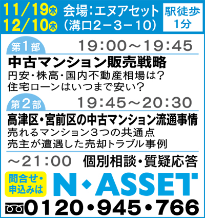 FPと現場から解説する大好評セミナー「いつが売り時!?不動産売却で損をしない方法」が11月19日(木)と12月10日(木)、地元不動産・(株)エヌアセットで開催される。19時〜20時半まで。