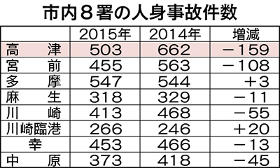 高津警察署(古宮忠男署長)はこのほど、2015年に管内で発生した人身事故件数をまとめた。人身事故件数は前年より159件少ない503件、減少率24%は県内トップとなる。同署は「事故の分析と時間と地点に絞った警戒が奏功した」という。これにより川崎市内8署中、10年以上続いた「人身事故件数ワースト1位」を返上した。