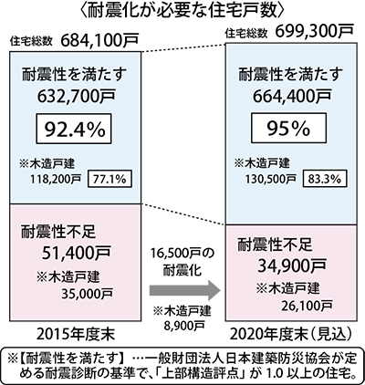 この計画は2007年策定の「市耐震改修促進計画」改定版で、今月7日まで約1カ月間の意見公募を経て作成。主な取り組みに、昨年12月末時点で77・1%にとどまっていた木造戸建住宅の耐震化率向上、新たな助成制度の運用などが盛り込まれている。