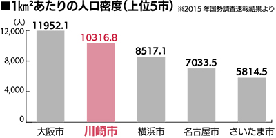川崎市の人口密度は前回の2010年調査と同様、大阪市に次いで2位。499・5人で20市中最も低い静岡市の約21倍にあたる。1万人を超えているのは川崎市、大阪市の2市のみ。