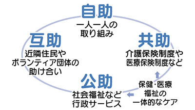 地域包括ケアシステムは、全ての住民が住み慣れた地域で安心して暮らせるよう、「自助・互助」を促し「共助・公助」に取り組む仕組み。医療や介護、福祉、生活支援など必要なサービスを必要な人に提供していく体制づくりを目指す。