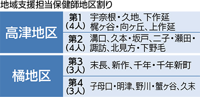 「地域支援担当」は母子健康手帳や乳幼児健診、子ども・子育て相談、健康づくり、介護予防など、「地域ケア推進担当」は民生委員児童委員、保護司会などの担当窓口も担う。