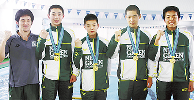 13〜14歳区分の男子400mメドレーリレーで、悲願の金メダルを手にしたのは、NECGSC所属の中学生4人。普段から高校生たちに混じって週7回の練習に取り組んでいる。
