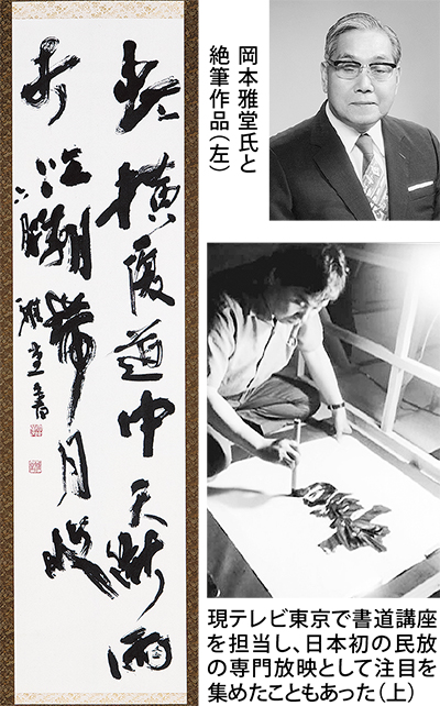 静雅(せいが)書道会(本部・高津区下作延)の創始者である故・岡本雅堂氏の生誕100年を記念した展覧会が4月26日から東京・銀座で開かれる。中央の権威ある団体には属さず「在野」にこだわり、地域貢献に尽力した岡本氏。生前は個展を開かず、今回が初の開催となる。