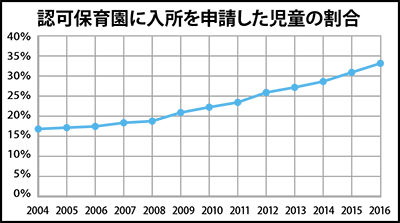 2004年に保育所に入所を希望した子どもの数は1万2916人でしたが、2016年には2万7576人に達しています。この間、子どもの数は7%しか増えていないにもかかわらず、入所を希望する子どもの数は実に114%も増えています。これは、入所を希望する子どもの割合が、16・9%から33・7%へと倍増しているからです。