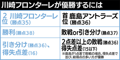 勝点1差で追う川崎フロンターレが優勝するには、引き分け以上が必要になる。鹿島が福岡に負けか引き分けた場合は、川崎フロンターレが大宮戦に勝利すると逆転優勝が決まる。川崎フロンターレが引き分けの場合は、鹿島が負けた上で総得点を上回らない限り、川崎フロンターレが優勝を手にする。
