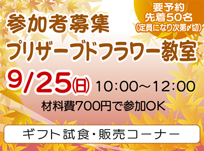 老舗葬祭会館として地元ならではの心のこもった信頼の「ご葬儀」を提供している『平安会館みやうち』では、毎回好評のプリザーブドフラワー教室を9月25日に開催する。参加費は材料費のみ700円。定員は50名で定員になり次第〆切。