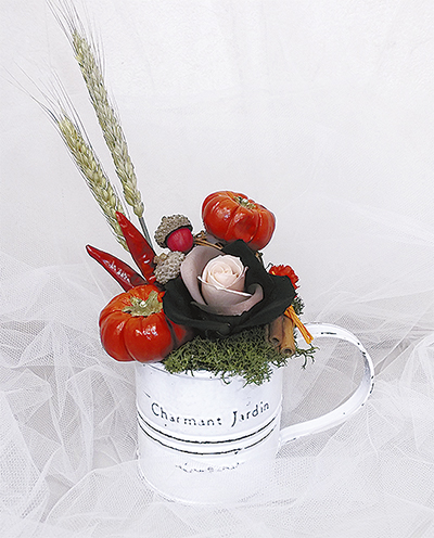 今回のプリザーブドフラワー教室のテーマは秋。ハロウィーンを意識したかぼちゃなど花以外のモチーフを加え、秋らしい温かみと落着きを演出する作品が作れるとのことだ。