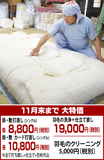 同社の特徴は熟練職人による布団の打ち直し仕立て。自分の好みの硬さ、厚み、体に合わせた調整をしてくれる。寒くなる時期に向け、ふっくらふかふかの布団に。「布団が重い」と感じる人はカード打ちがお勧め!出張無料。まずは【電話】を。