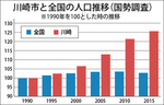 他方、川崎市の人口は147万5213人であり、前回2010年調査と比べると、4万9701人(3・5%)増えています。2005年から2010年までの5年間では約10万人増えていましたので、やはり伸び方は鈍化しています。