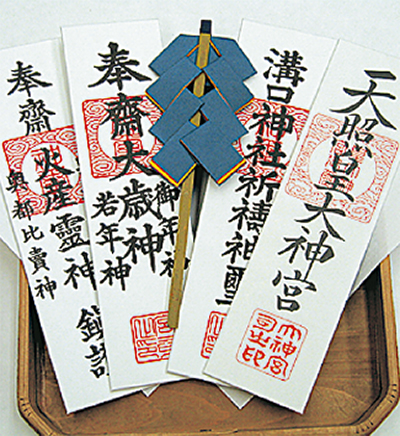 同神社が頒布する大麻は神宮(伊勢神社)、荒神(火の神様)、歳神(年の神様)、溝口神社の御札4体ひと揃え(御初穂料3500円)。 問い合せは同神社(【電話】044・822・3776)へ。