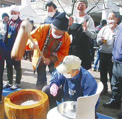 住民の交流を図ろうと「メイフェアパークス溝の口」で1月29日、恒例の餅つき大会が行われた。同所の自治会「メイフェアクラブ」が主催。今年は近隣マンションのザ・タワー&パークス自治会とパークシティ溝の口の有志も協力。当日は、住民がついた餅を772パック配布。豚汁やお汁粉なども振るまわれ、3マンションの住民が交流を楽しんでいた。