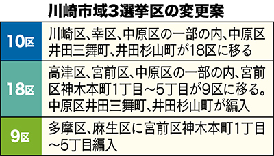 変更内容は▽10区・中原区の井田三舞町、井田杉山町が18区に移る▽18区・10区からの編入に伴い、宮前区神木本町1丁目〜5丁目が9区に移る▽9区・18区からの編入を受け入れる―となっている。