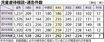 川崎市内3カ所の児童相談所で受けた2016年度の児童虐待相談・通告件数が過去最多を更新した。15年度に比べ214件増の2134件。市は市民の中で通告義務の認識が高まる一方、家庭内暴力等の目撃が影響する心理的虐待の増加も要因と見ている。