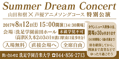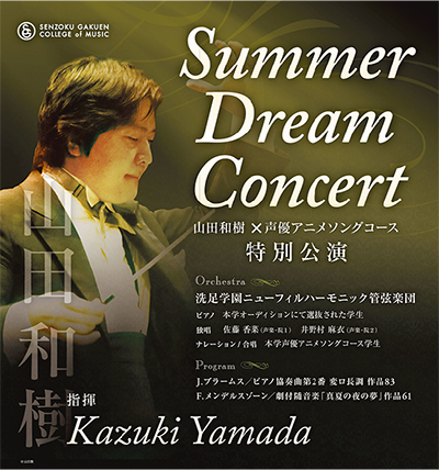 世界の第一線で活躍し、今、最も注目される若手指揮者、山田和樹氏と洗足学園音楽大学声優アニメソングコースがコラボする特別公演「サマードリームコンサート」が8月12日(土)、同大学の前田ホールで開催される。入場無料。
