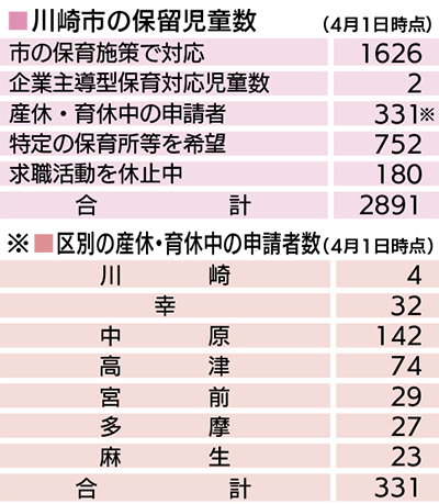 川崎市の前回集計ではこの新定義は適用されておらず、申請をしたものの、保育所を利用していない「保留児童」は2891人だった。そのうち、「産休・育休中の申請者」は331人で、このうち何人が新たに待機児童として集計されるのかがポイントとなる。