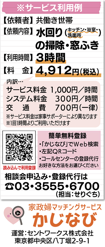 「家政婦マッチングサービスかじなび」は、川崎市内を対象に利用者と家事を行う家事サポーターをつなげるWebサイトだ。利用者は登録(無料)後に家事内容や時間、料金など、自分の希望するサービス依頼を作成し、条件に合う「家事サポーター」に依頼できる。