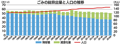 人口増と経済発展にともなう「ごみ」急増は、都市部における大きな問題でした。本市も例外ではなく、1990年には「ごみ非常事態」を宣言する危機的状況に置かれ、市民と事業者、行政の協働で、ごみの減量化・資源化が進められてきました。