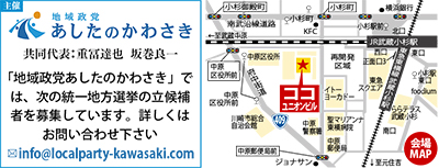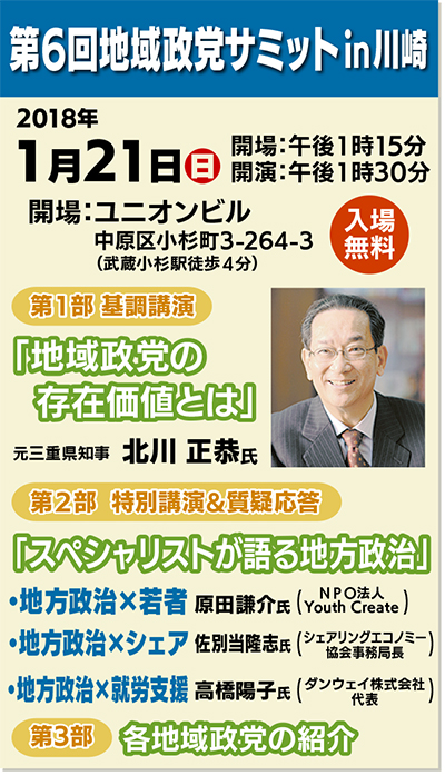 それぞれの地方自治体で活動する地域政党が集まり、その役割や地方政治を考える『地域政党サミット』が1月21日(日)午後1時30分から、ユニオンビル(武蔵小杉駅徒歩4分)で開催される。主催は「地域政党あしたのかわさき」。