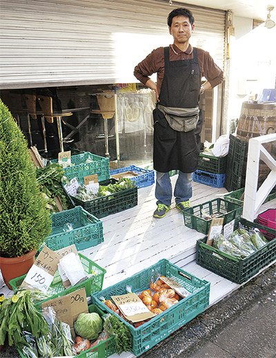 溝口駅近くの飲食店前などで定期的に開かれている野菜の路上販売がにわかに注目されている。末長在住の鈴木善徳さん(53)が営む「お美味(うま)さんくらぶ」だ。