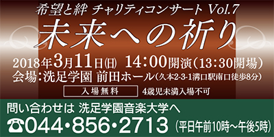 洗足学園音楽大学は3月11日(日)、東日本大震災被災地支援のための「希望と絆 チャリティーコンサート」を開催する。
