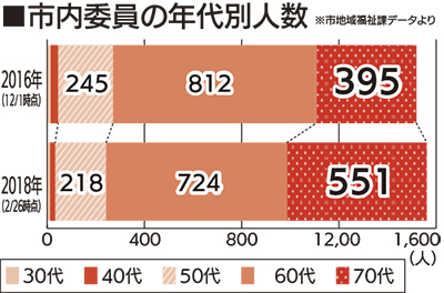 委員確保のため市は一昨年、新任の年齢要件を72歳未満から75歳未満、再任は75歳未満から77歳未満に引き上げており、高齢化を進行させる一因に。市地域福祉課では「若い人にも関心を持ってもらいたい。PTA協議会への依頼など、幅広い世代に呼びかけていく」と方針を示す。