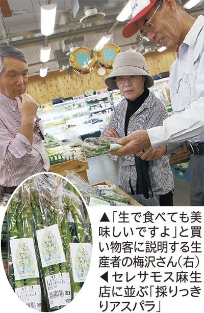 麻生区黒川地区で新しい栽培方法で育てたアスパラガスが初収穫を迎えた。高付加価値生産物として期待され、3月中旬からJAセレサ川崎「セレサモス麻生店」の店頭に並んでいる。