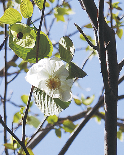 千年の大川健さん(75)宅の庭で「ハンカチの木」が見ごろを迎えている。
