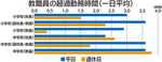 下記のグラフは、教職員の学内勤務時間から正規の勤務時間である7時間45分を引いた「超過勤務時間」を示したものです。これによると、中学校教諭は平日3時間38分、休日3時間50分、小学校教諭でも平日2時間55分、休日24分となっています。1か月の勤務時間に換算すると、中学校教諭の月間残業時間は約111時間、小学校教諭で約66時間となります。