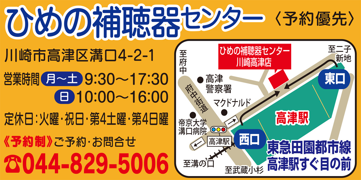 高津駅目の前にある「ひめの補聴器センター」は、川崎市内でも少ない認定補聴器技能者が常駐する専門店で、大学との共同研究にも参加している。実生活を重視した独自の3カ月調整プログラムが成果を上げており、「補聴器をつけて良かった」などの、多くの声が寄せられている。せっかく買ったのに約6割の人が満足していない補聴器。その理由の多くに調整不足がある。「補聴器は細かな調整こそが重要です」と西尾さん。同店では他店で購入した補聴器も対応してくれる。