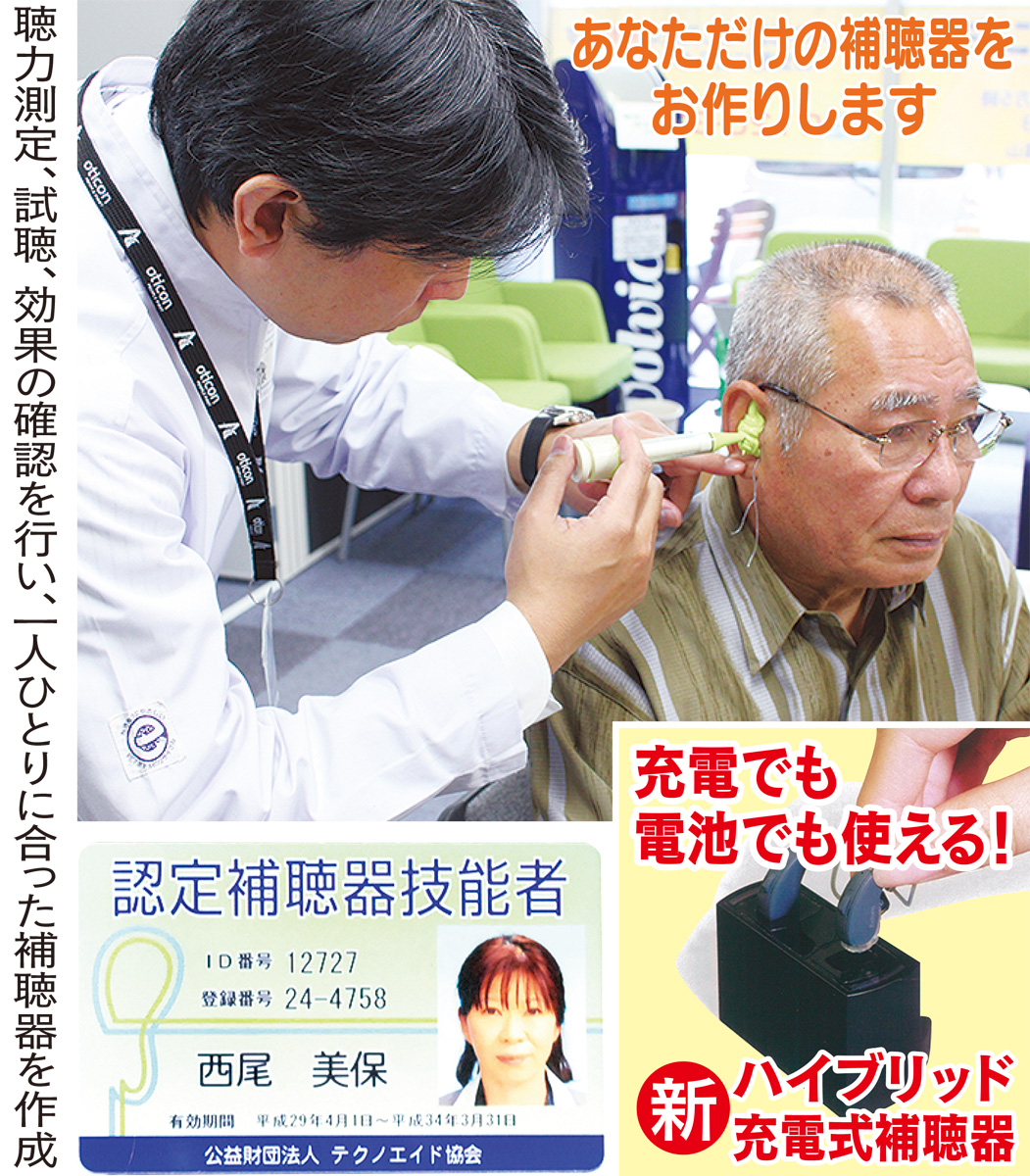 最新モデルでは充電でも電池でも使えるハイブリッド補聴器も登場。また、スマートフォンで補聴器を捜せる機能や、TVの音が直接聞こえる機能がついたモデルも人気。ぜひ、家族で相談に訪れてみては。事前に予約を。