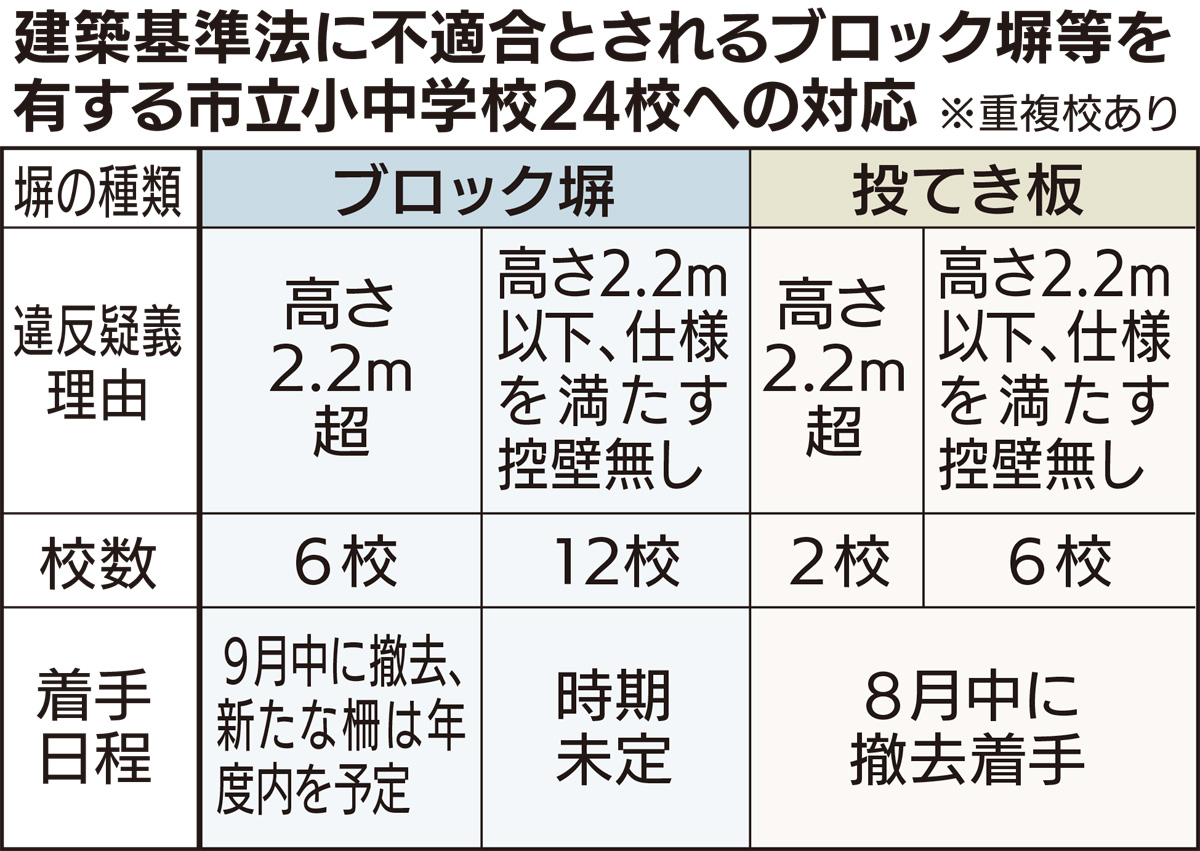6月の大阪北部地震で登校中の女児が倒壊したブロック塀の下敷きになって命を落とした事故を受け、市は市立学校のブロック塀を6月下旬に点検。24校(小学校21校、中学校3校)で建築基準法違反の疑いがある塀などがあると発表した。