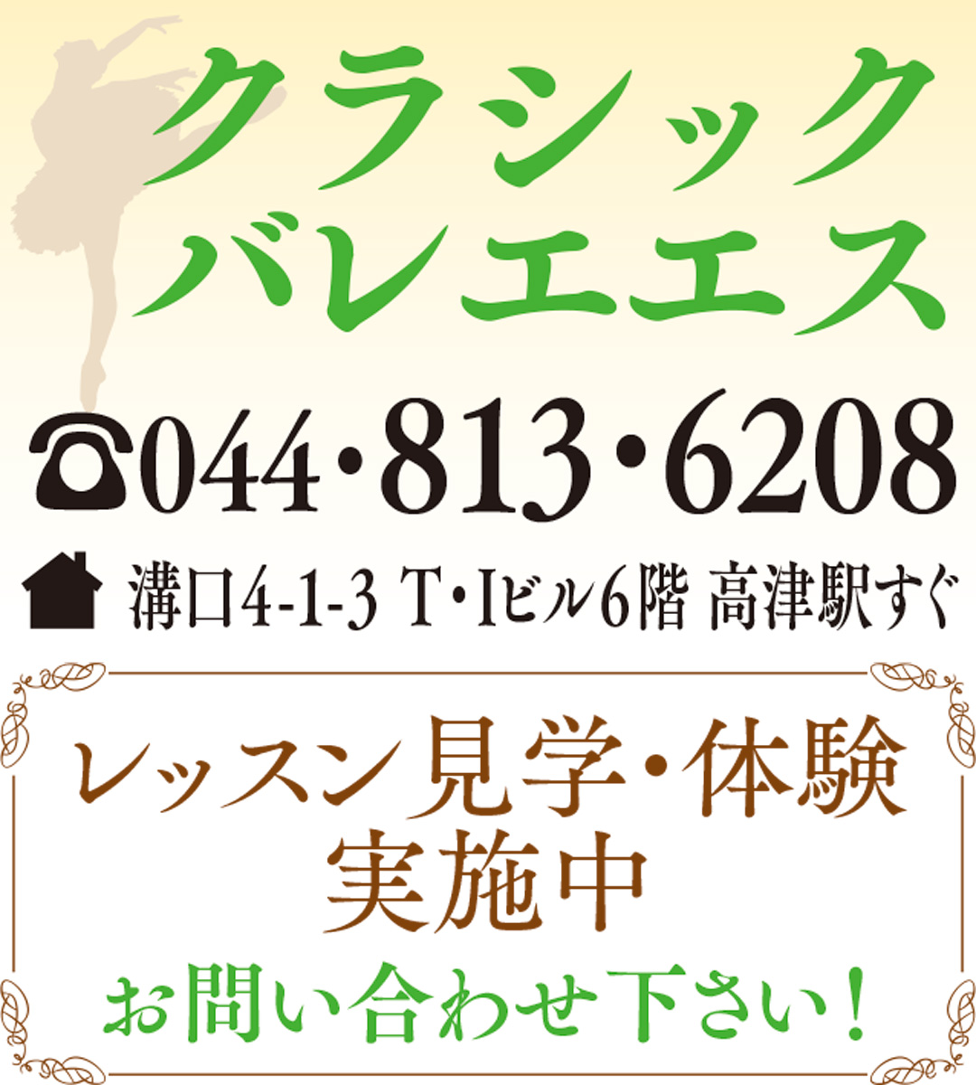 高津駅徒歩1分の「クラシックバレエエス」は、シニア世代の生徒が多く通い、その半数は初心者だ。「健康目的に運動を始める時、憧れのバレエを、という方が多いです」と同教室の高井先生。バレエストレッチ、バーレッスン、センターレッスンなど基礎を丁寧に指導する。無理せず自分のペースできるところも初心者には安心。「姿勢を意識するようになり、心にハリが出る」という声も。