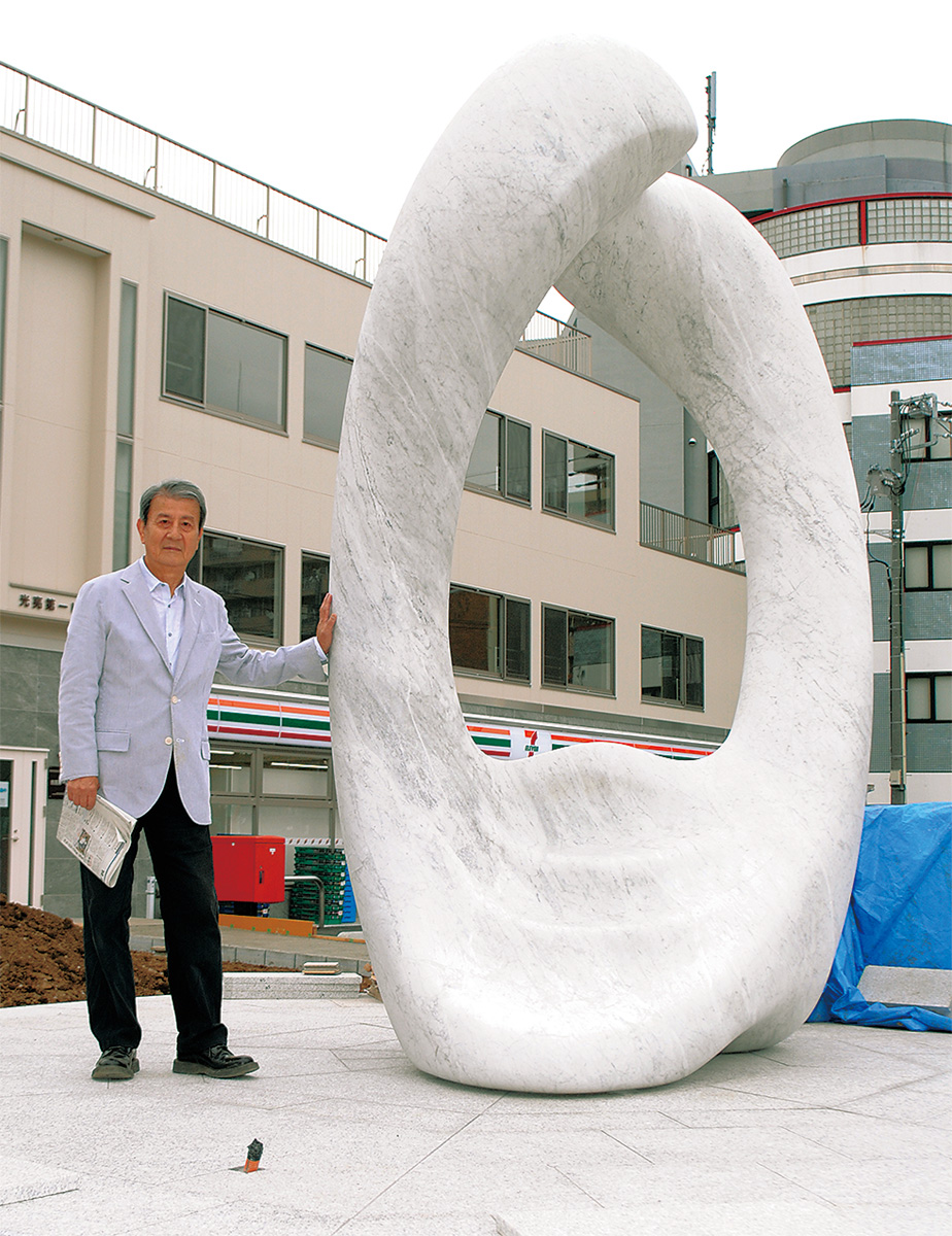 イタリア産の大理石をベースに作られたオブジェは、高さ3m、幅2m、重さ7tと存在感がある。福住さんの自宅には、既に三分の一ほどの同じオブジェがあり、見た人から「気持ちが沈んでいたけれど、元気になった」との声が寄せられている。地元や通る人々などに元気を届けられたらという思いで建設を決めた。
