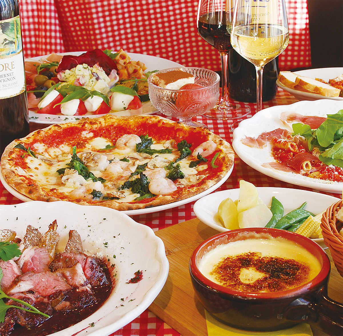 石釜で焼く薄焼きローマスタイルのピザが看板商品。350℃〜400℃の高温で焼き、表面はカリッ、中はふっくらした食感が特徴だ。ワインが抜群に進むと好評のクリームフォンデュはさらっと軽く、なめらか。ぜひお試しを。