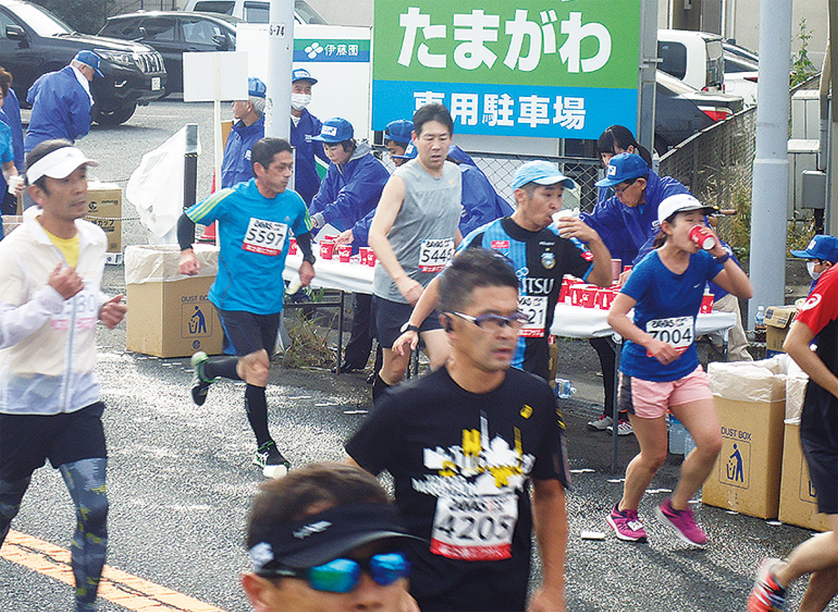 選手たちの熱い走りを応援しようと、下野毛町会の住民が沿道で給水のボランティアを行った。市民マラソンの時代から20年続くもので、当日は40人以上が参加。笑顔で選手に飲み物を手渡し、声援を送っていた。