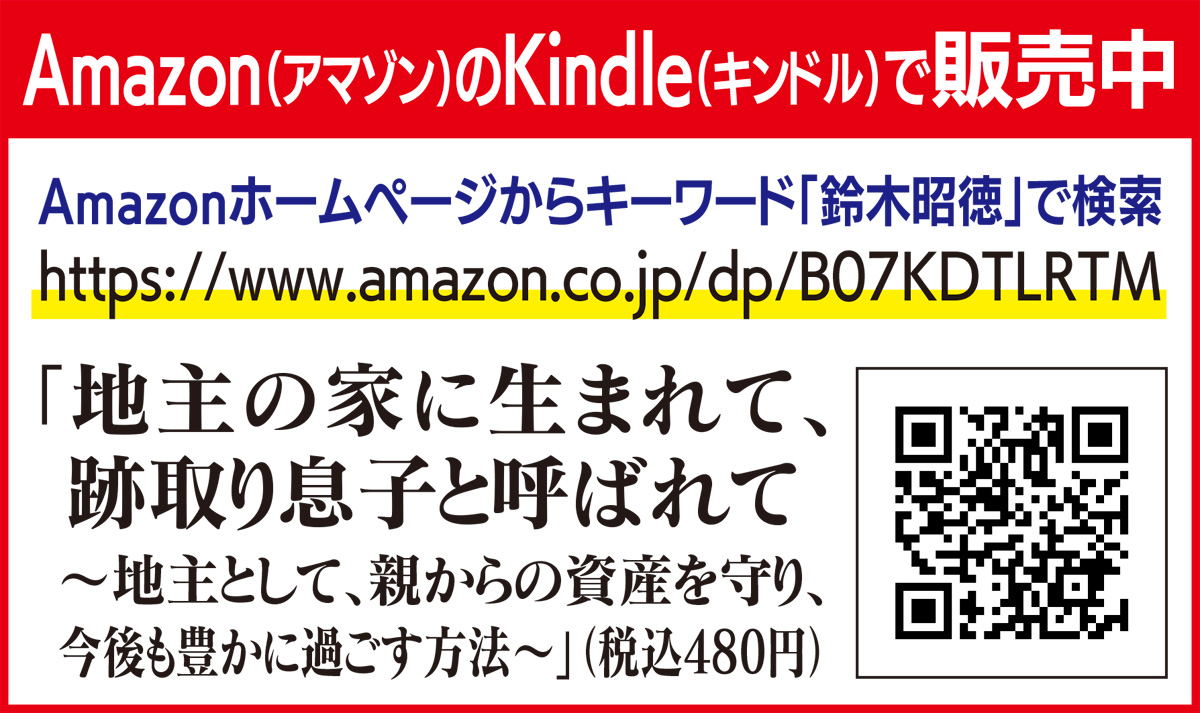 諏訪の不動産会社(有)シンクリエイティブの代表を務める鈴木昭徳さん(47)が、電子書籍「地主の家に生まれて、跡取り息子と呼ばれて〜地主として、親からの資産を守り、今後も豊かに過ごす方法〜」を出版した。アマゾンのキンドル(電子書籍)ランキング1位4冠を獲得し話題だ。