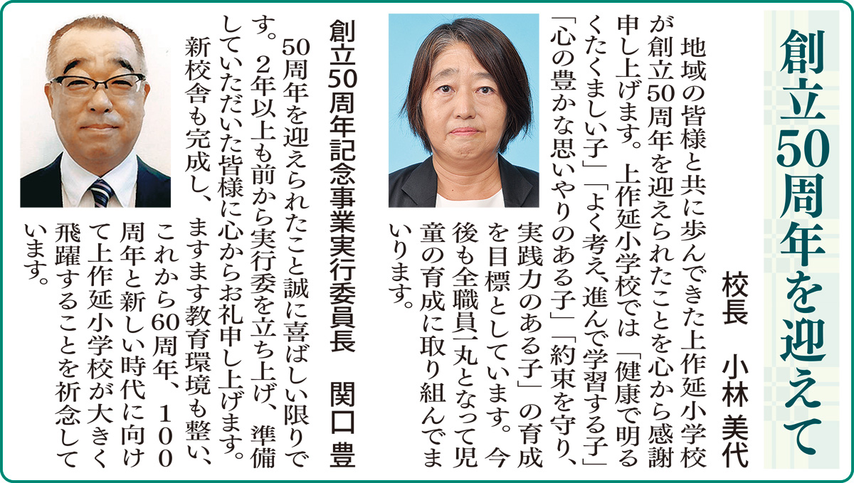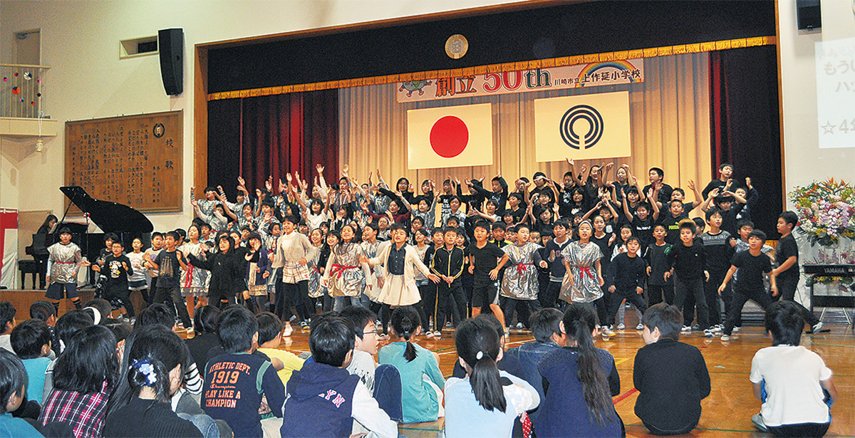 川崎市立上作延小学校(小林美代学校長)で12月1日、創立50周年式典が開催された。式典には福田紀彦市長や歴代PTA会長、地域代表など多数が来賓として参加した。式典では児童の成長を伝えようと、学年ごとに劇や歌、企画など趣向を凝らした発表で学校や地域への感謝を披露した。
