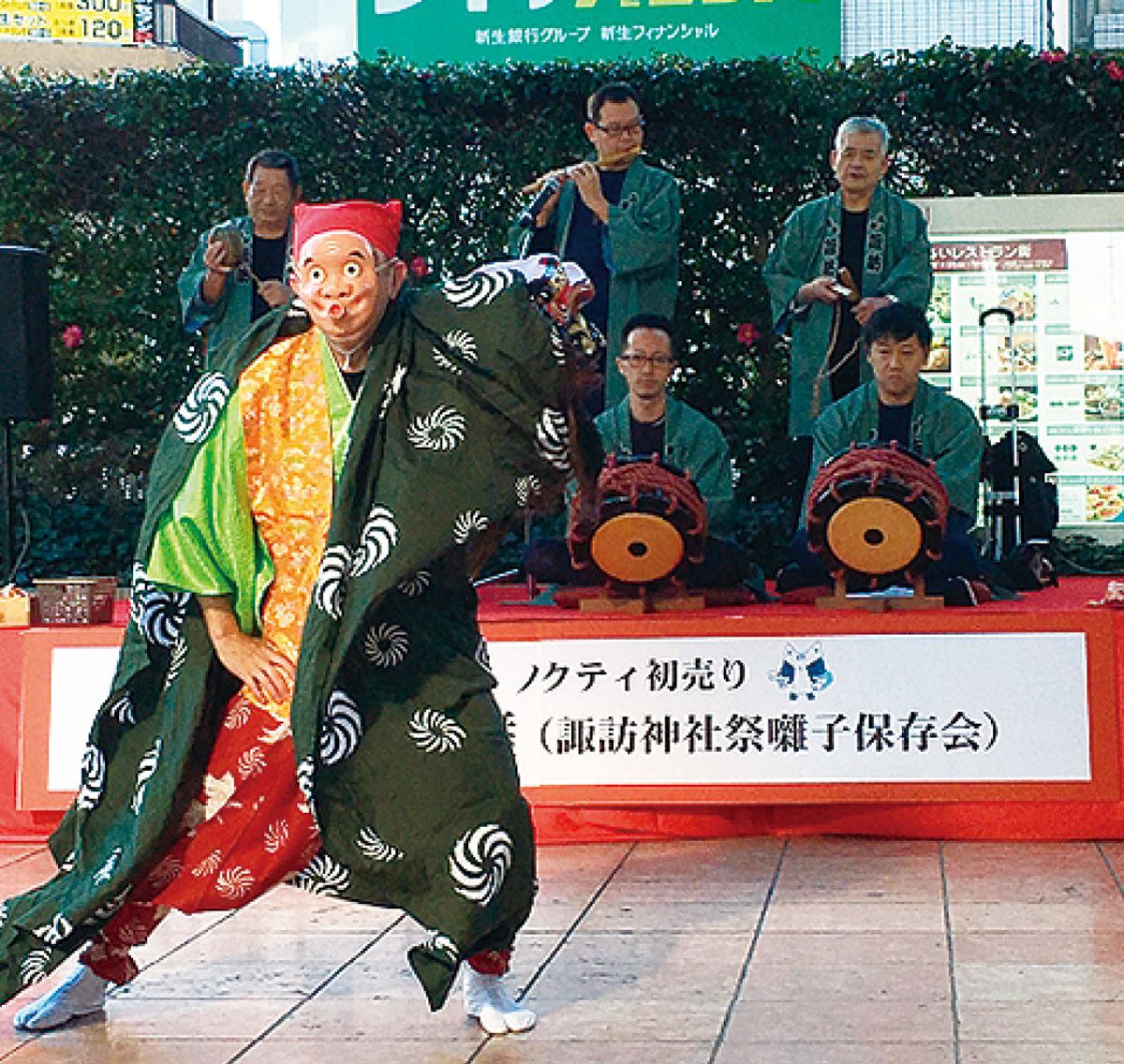 新年の初売りでにぎわうノクティで1月2日、諏訪神社祭囃子保存会によるお囃子と祝いの舞が特設舞台で披露された。