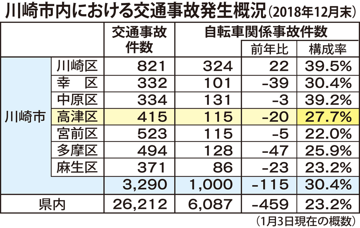 市内では17年12月、麻生区でスマートフォンを操作しながら電動自転車を運転していた女性が歩行者をはねて死亡させる事故が発生。市内で最も事故が多い川崎区の川崎警察署交通課長は「自転車も車両という意識を持ってもらいたい。加害者になることもあるので、自転車保険に加入してほしい」と訴える。