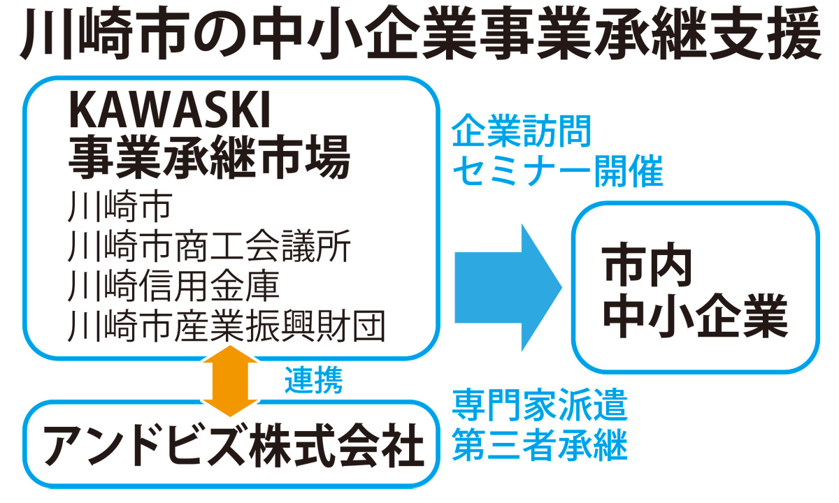 そのような状況を受け、川崎市では全国に先駆けて、市や市商工会議所、川崎信用金庫、市産業振興財団の4者が協定を締結し、「KAWASAKI事業承継市場」として取組みを始めました。窓口相談や企業訪問、セミナーなどを通じて中小企業者の意向に沿った事業承継支援を行っています。