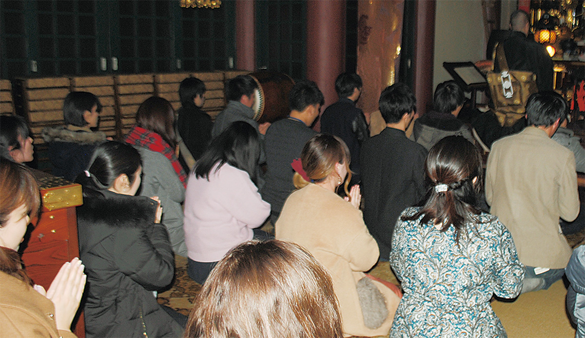 溝口の宗隆寺で1月26日、「寺コン」が開かれ、男女21人が参加した。県第一部日蓮宗青年会の主催。寺コンは、座禅や唱題などの仏教体験を通して男女が交流する婚活イベント。お寺で開催という安心感もあり県内各地で人気となっている。