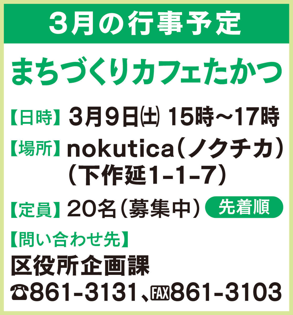 高津区では、3月に「まちづくりカフェたかつ」を開催します。