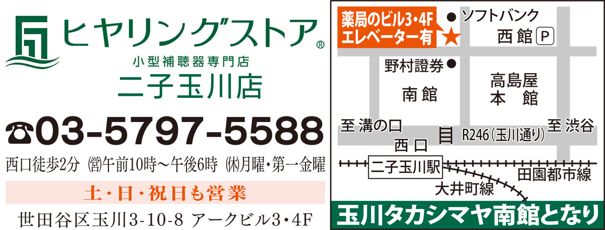 二子玉川駅西口徒歩2分。「小型補聴器専門店ヒヤリングストア二子玉川店では、3階に加え4階に増床しスタッフも一新。更に世界6大メーカーを取り扱っています」と同店の舛川店長。