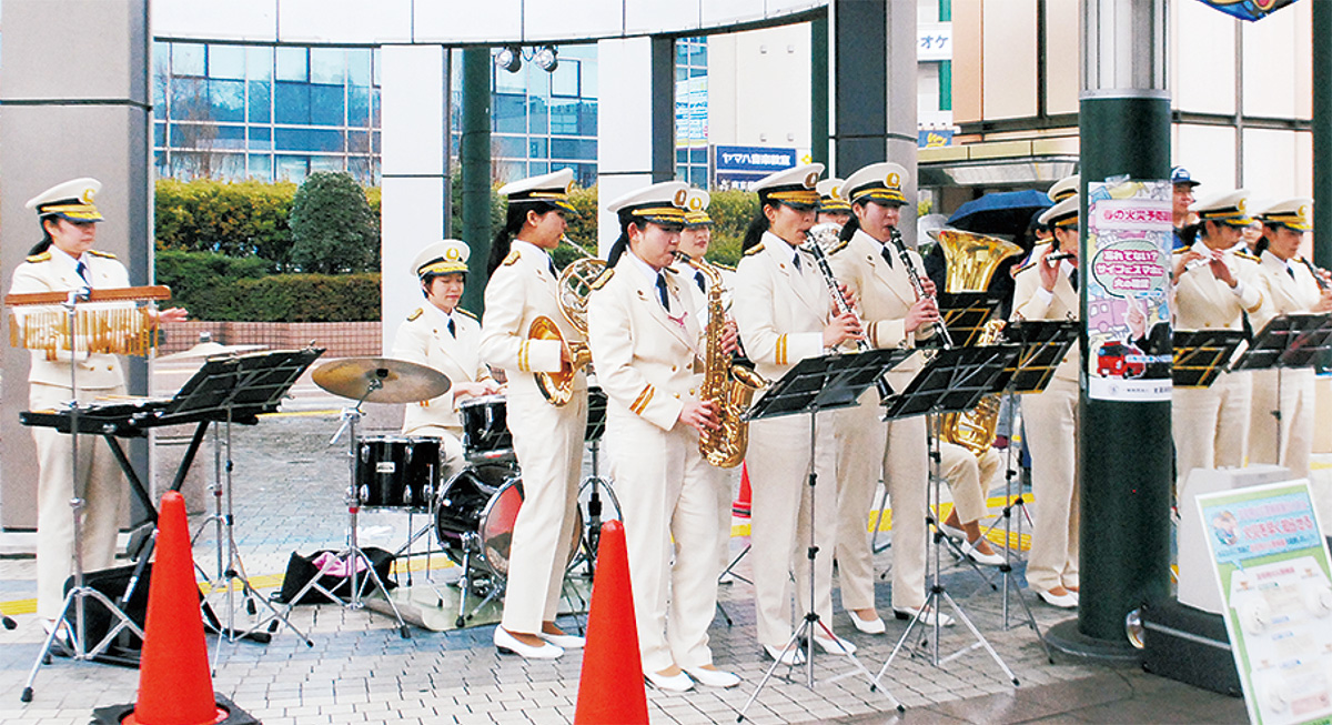 当日は、高津消防署員らが啓発物300個を配布しながら、通行人に火災の注意を呼びかけた。川崎市消防音楽隊によるコンサートには、雨にも関わらず大勢の人が演奏に聴き入っていた。