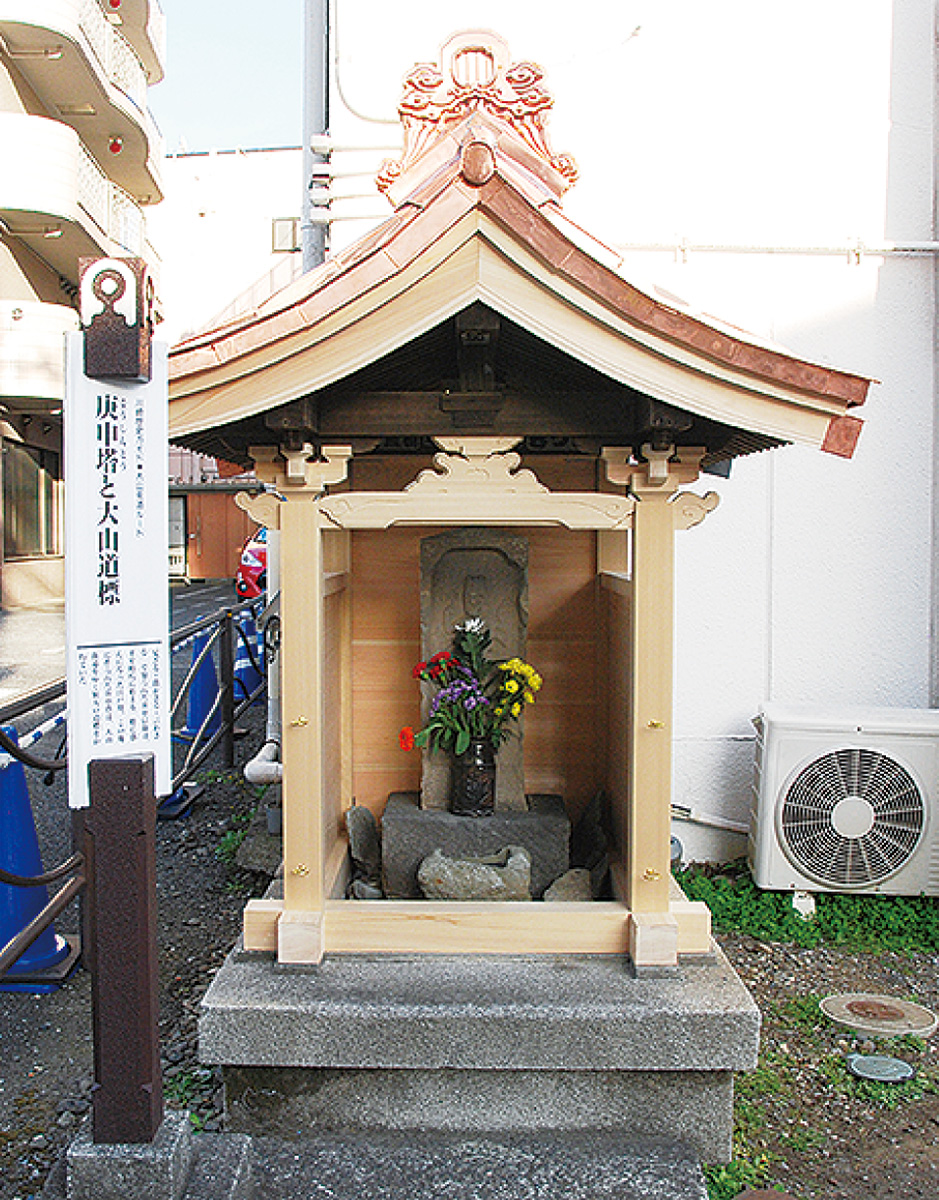 庚申塔とは、庚申信仰に基づく石塔のことで、信仰は庚申の日に徹夜して健康長寿を願う。片町の庚申塔は大山街道の道標をかねているとされ、「東江戸」「西大山」、「文化3年」(1806年)と刻まれている。